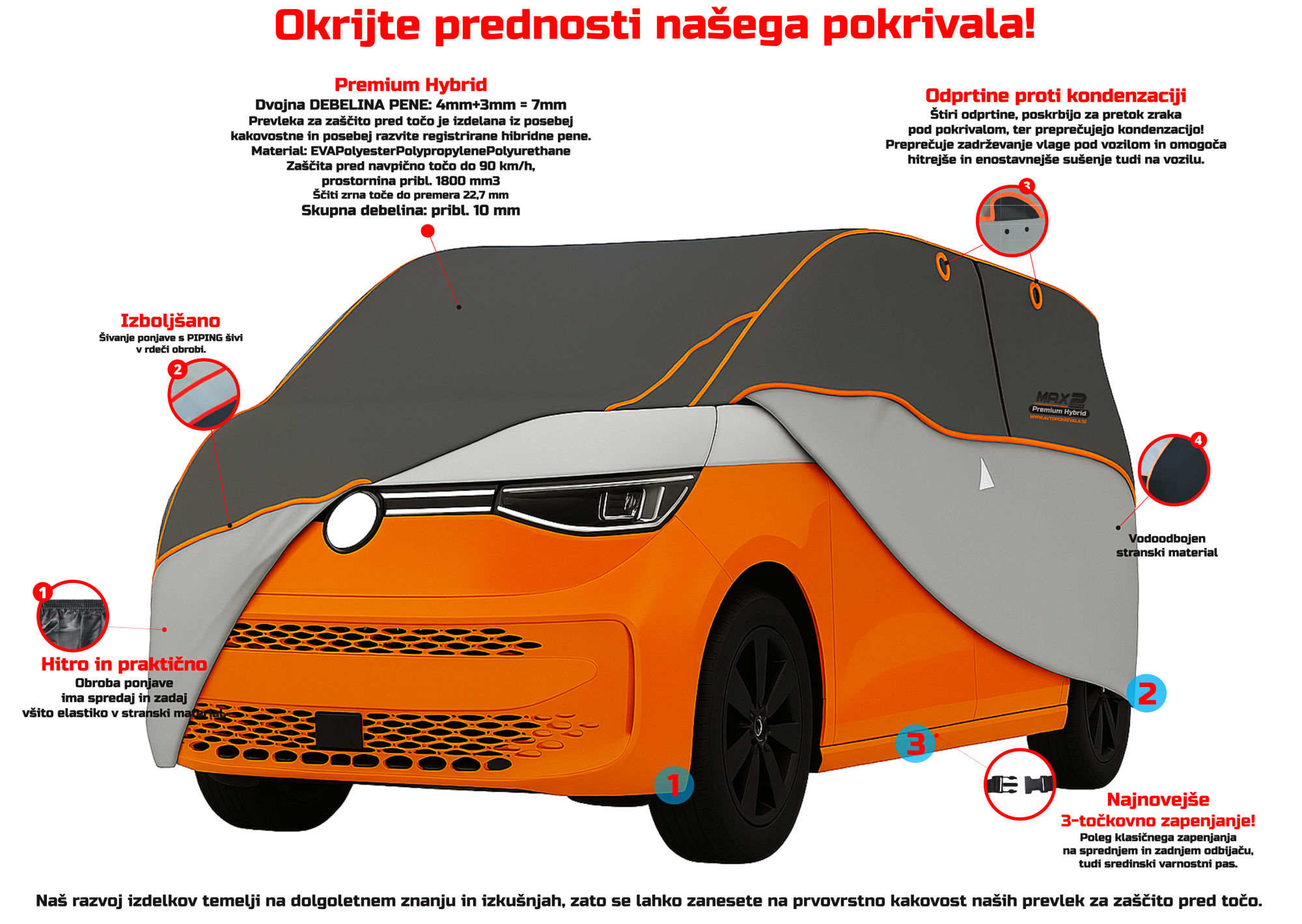 Naše originalno pokrivalo vsebuje dejansko zaščitno plast HIBRIDNE PENE debeline 7 mm (4 mm + 3 mm), ki je bila razvita posebej za blaženje močnih udarcev toče. Gre za tehnologijo, ki temelji na dolgoletnih raziskavah in testiranjih.